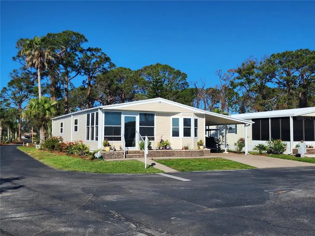 This is the One! Furnished and Turnkey ~ pride of ownership shows in this renovated home located on a corner lot in the sought after pet allowed and greenbelt area offering a backyard oasis and Privacy! Loads of beautifully done updates including updated kitchen with gorgeous solid wood cabinetry, granite countertops, new sliding patio door with built in blind, both bathrooms have been nicely updated, brand new AC August, 2025 with transferrable warranty, 4 year old metal Roof with warranty, newer vinyl windows, vinyl siding, crown molding in Living Room/Dining room, pest eliminators transferrable contract thru Dec 2025, outdoor shower with enclosure, large concrete patio pavers with lush mature landscaping, 3/4" plywood was installed under flooring throughout, wall in living room double insulated and sound proof, custom blinds on windows, extra tie downs, no hurricane damage, epoxy driveway, programmable thermostat, shed for storage, newer washer and dryer in unit with sink for convenience. There are lots of sun-filled spaces to enjoy including the front Florida room with tile flooring, ceiling fan and window shades. Security Camera on rear of home solar powered and also blink camera on front carport included. Discover Florida Living at its Finest at Polynesian Village Community that offers amenities such as a pool, shuffleboard courts, and a clubhouse hosting numerous activities. The hoa fee covers basic cable, fiber-optic internet, lawn mowing and upkeep of the association amenities. There is also a storage yard with spaces for rent at a low $130/year. Don't miss out on this incredible opportunity and rare find! Schedule your private showing today!