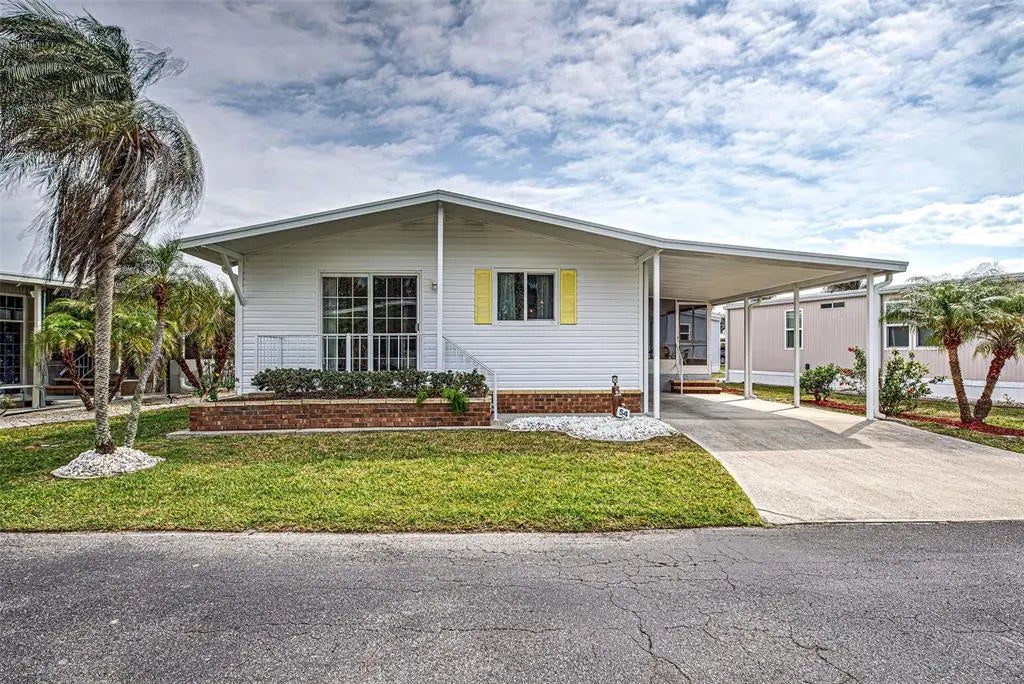 RESORT STYLE LIVING IN DESIRABLE POLYNESIAN VILLAGE - COASTAL CHARM WITH EASY BEACH ACCESS! This unique 55+ community is tucked away off the beaten path, yet just one mile to the shimmering waters of the Gulf of Mexico and sparkling sands of scenic Manasota Key. Come take a look at this well-maintained FURNISHED property with a beach vibe. The vaulted ceilings and great natural light give this home a spacious feel. Upon entering you will appreciate the custom built in storage unit and other functional closets. The kitchen has good cabinet space, built in breakfast seating and adjoining dining area with integrated storage space for serving dishes, linens & other essentials. New water-resistant vinyl flooring. Windows have been replaced. Bright and inviting, the living room has a set of sliding glass doors that can be used as an entry or front patio. Comfortable guest bedroom and a primary bedroom that is large enough for a king size bed! Want to enjoy those clear, sunny days outdoors? Just pull up your lounger and relax on the 12x13 screened in elevated lanai. Structurally sound, reinforced with additional tie-downs. The driveway has 23x14 feet of covered carport. The entire exterior vinyl siding has been replaced. Community amenities include pool with sundeck, large clubhouse with updated kitchen, library, and billiard room. Outdoor shuffleboard and beautiful centralized pond with fountain. Low fees with great provisions including fiber optic cable and internet service, grounds maintenance, and on-site manager. Storage area on site for RV and Boats and Trailers. Come visit this welcoming community and consider Polynesian Village for your winter retreat!