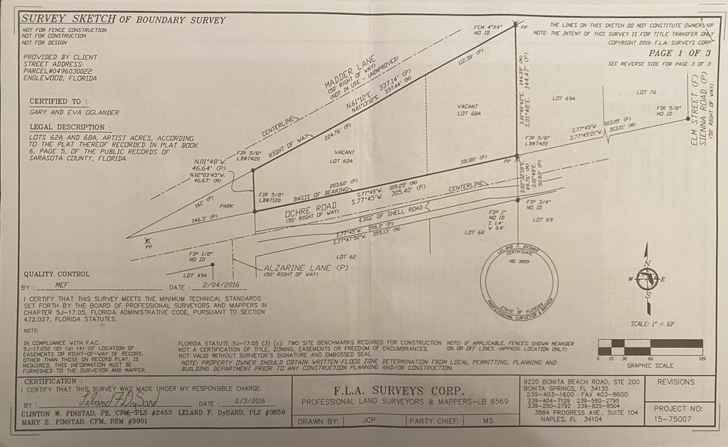 Lovely buildable lots in a serene and secluded portion of NW Englewood. There are two lots under one parcel ID. The shell road entering into the property exudes the privacy and tropical nature of these two parcels. A survey is available and the Englewood Water district assessment has been partially paid. There is a balance of $3345.12 due upon building lot improvement, and $2853.00 has been paid so far. You can become one of the few fortunate individuals to own and build in Artist Acres. Madder La is no longer used and is a 50' easement. Ochre La is a shell road to the property.