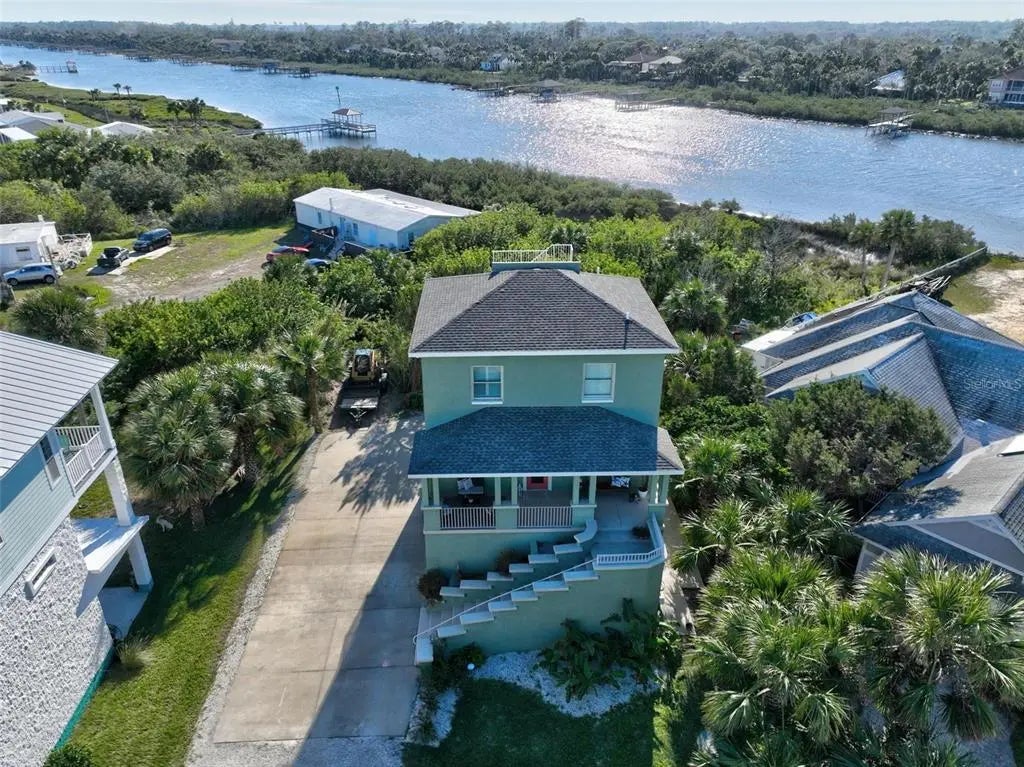 Coastal design meets modern construction all in walking distance to the beach with a deeded beach access. Built in 2021 with eight inch concrete walls, cement board soffits, a large solid concrete safe room with eight inch thick concrete ceiling. Oversized foundation footers, all exterior steps are concrete, the roof top patio is concrete. Elevator shafts are in place and insulated and wired. When first walking up to the home you are greeted with a cozy front porch. As you enter the main level of the home which is the second story from the ground you have the living room and kitchen. The kitchen has high-end cafe' appliances, and there is a walk in pantry. Off the living room is one of the two primary bedrooms with an ensuite. Going up stairs you have the main primary with an ensuite, a sitting room, and a third bedroom. From this level you access the stunning roof top patio to take in the 360 degree views of the intracoastal and the Atlantic Ocean. From the main level of the home you will access the downstairs ground level which has the safe room with a small kitchenette that is being used a bedroom, storage and garage access. Beautiful engineered Luxury laminate floors, plantation shutters, and coastal charm exudes throughout this home. Located minutes from downtown flagler beach with shops, and restaurants. Major highways can be accessed in 15 minutes making commuting easy.