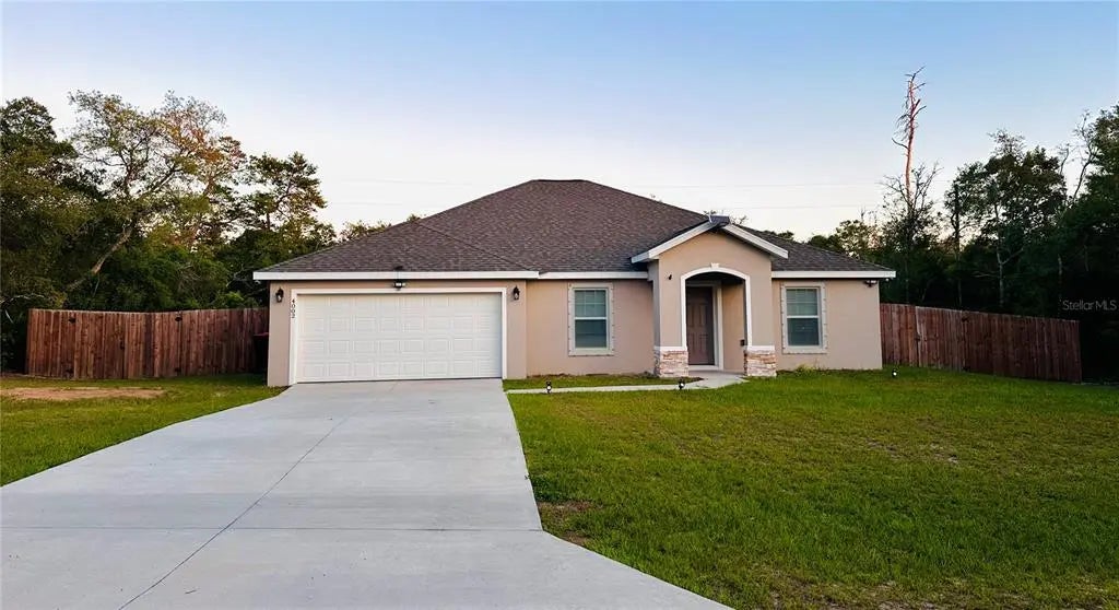 PRICE REDUCTION! Come see this beautiful newer construction 2022 built home in the highly desired area of Marion Oaks. Open floorpan with a large entry/foyer area and vaulted ceilings gives ample space to entertain family & friends, which leads out to a large privacy fenced backyard with an upgraded covered 16' x 20' back porch area. This 1826 square foot home has plenty of space, with its 3 bedrooms AND the additional front den/office space that can be used as a 4th bedroom if needed. The kitchen is an extra large gourmet style, with upgraded stainless steel appliances and see thru door style refrigerator, a designated dining space with added additional storage cabinets and counter space for those family meals. the large bar area gives plenty of additional seating space. Fitted hurricane shutters to use for extra protection during any possible Florida storms. Installed security system, with a 360 degree view gives you an extra peace of mind. Backyard features a large 100 square foot shed with additional lofts for extra storage space.