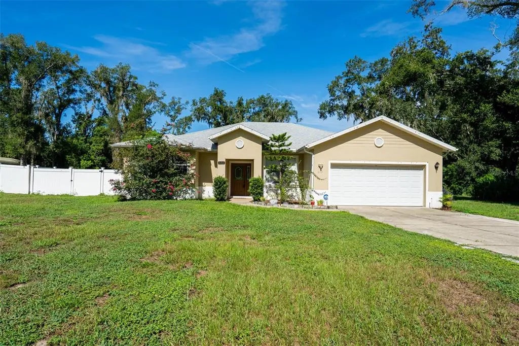Here's your chance to enjoy space, privacy, and flexibility all while staying connected to everything Central Florida has to offer. Set on over a HALF ACRE in Fruitland Park with no direct rear neighbors, this updated 3-bedroom, 2.5-bath home offers a thoughtful layout and plenty of room to grow. As you enter, you're welcomed by a bright open layout and spacious main living area ideal for relaxing or entertaining. To the right, you'll find a versatile office or den, and to the left, a large primary suite with sliding doors that open to the enclosed back patio. The primary bath includes a walk-in shower and a garden tub for total relaxation. Toward the rear of the home are two additional bedrooms and a shared full bath, completing the split floor plan design. Recent updates include a NEW ROOF and HVAC (2024), and a convenient exterior half bath off the patio, perfect for guests and outdoor use. The seller will have the half bath painted to match the home's interior before closing. Out back, the expansive yard includes a thriving garden filled with fruits, herbs and edible plants, which can either remain or be cleared by the seller upon request. Located just minutes from Leesburg, approximately 35-40 minutes to Downtown Clermont, and about an hour from Orlando, this property offers the best of both worlds: peaceful living with easy access to shopping, dining, and major roadways.
