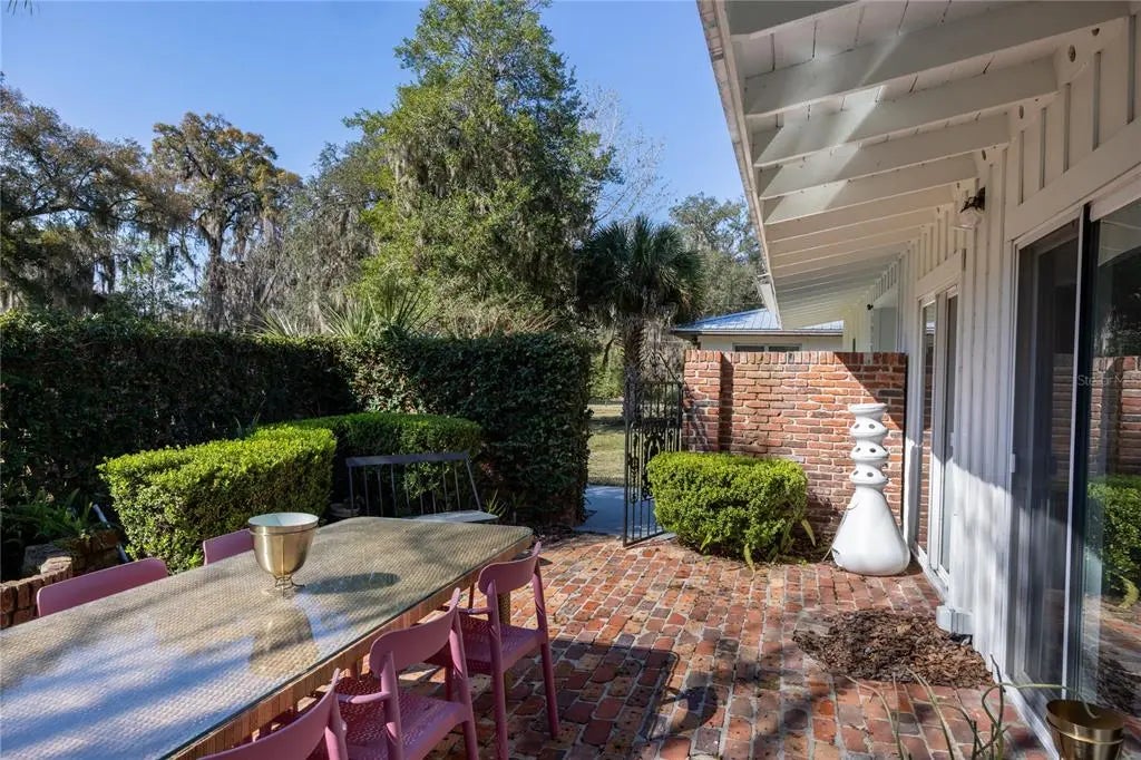 Fantastic Mid-Century Modern pool home for sale in NW Gainesville's Florida Park. This 4 bedroom, 2 bathroom home plus flex space and detached studio is ideally located just 1 mile north of the University of Florida's main campus. Florida Park has gentle rolling hills, meandering creeks and is centrally located to nearby offices, shops and restaurants. Located on a quiet interior street, this home has a large nearly half acre lot with a circular driveway and a beautiful front brick walled courtyard with fountain. Built in 1960 by MM Parrish, the interior space is over 3,500 square feet. From the covered front entry you step into the open floor plan with a ton of natural light, large walls of windows and skylights throughout. To the right of the foyer is the large Living Room with tiled floors, crown molding and sliding glass doors that open to the front courtyard. Off the Living Room is the separate Dining Room with views of the courtyard and updated modern lighting. Straight ahead of the foyer is the large Family Room with walls of windows overlooking the pool, tiled floors and wood burning fireplace. The Family Room opens to the large kitchen with wood cabinets, granite counter tops, center island with breakfast bar and nook, pantry and stainless steel appliances. The Kitchen also connects to the Dining Room. To the right of the Kitchen is a large flex space with room for workout equipment, office or seating area. The Flex Room connects to two guest bedrooms with new carpet and paint, as well as a Jack and Jill Bathroom with separate vanities, toilets and shared shower. Each room has large banks of closets for storage. Also off the Flex space is the indoor laundry room with washer and dryer, storage closet and door to a second utility courtyard perfect for bike storage or the grill. On the other side of the home, to the left as you enter the foyer, is the Primary Bedroom with a wall of closets, views of the pool and updated lighting and paint. The bathroom has a large vanity with stone counter tops, separate shower and water closet. The 50 year metal roof was installed in 2017. HVAC 2023. Off the rear of the home is a large paver patio, salt water pool and a detached studio apartment. The studio has new sliding glass doors, high ceilings and separate mini-split HVAC. This space is perfect for an art studio, home office or separate guest room. No HOA. The home is zoned for Parker Elementary, Westwood Middle and Gainesville High Schools..