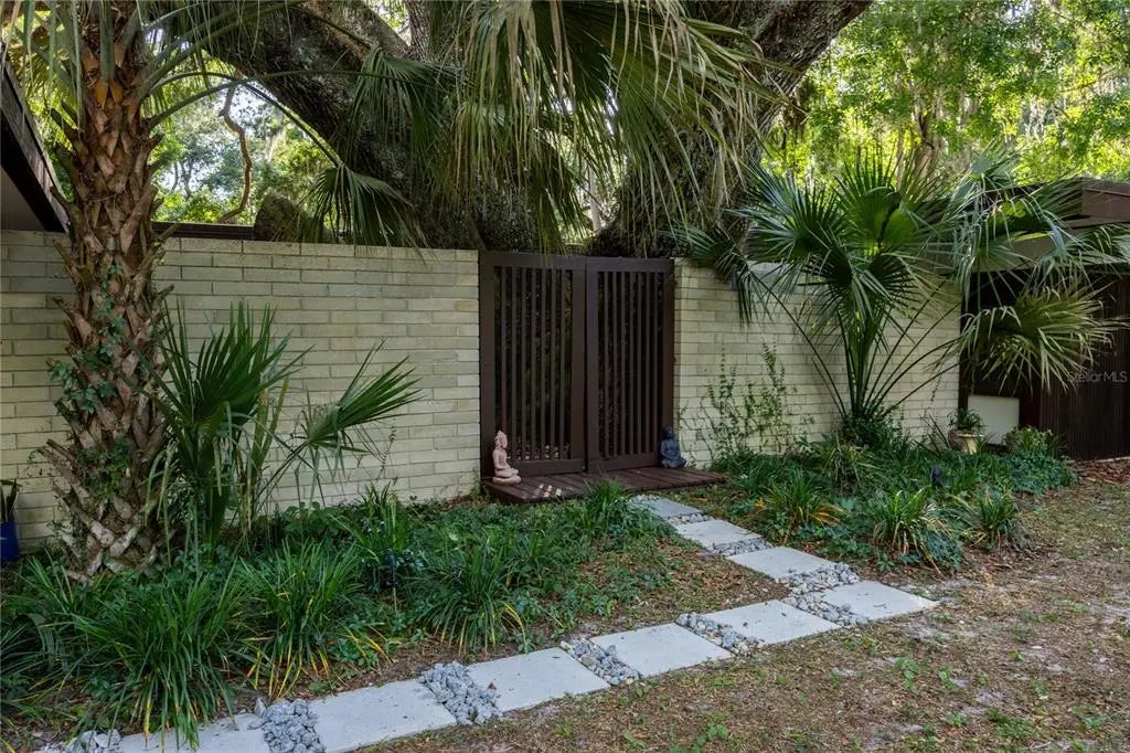 Here is your chance to live in a rare Mid-Century Modern gem. With its clean lines and harmonious integration with nature, the 1966 Haynes Residence is a Mid-Century Modern masterpiece. Designed by Architect Harry Merritt and inspired by the Case Study Houses of Southern California and Frank Lloyd Wright’s Usonian houses, this courtyard home embodies tranquility and architectural clarity with a palette of redwood siding, Ocala block walls and terrazzo floors. Its expansive glass walls look out over a 1.65-acre property, which backs onto undisturbed forest one block from Newnan's Lake. For lease, This 3 bedroom plus office, 2 bathroom home respects its original design while breathing new life into its iconic elements with subtle sophistication. Available now. Extensive updates include a new commercial grade roof, repaired eaves, improvements to the plumbing and electrical systems, paint, wallpaper and meticulously restored terrazzo floors. The home is centered on a majestic Live Oak tree in the courtyard, which is visible from every living space through continuous glass walls. The courtyard’s deck and generous eaves create a dynamic outdoor living space that connects to the kitchen and dining rooms through a wall of sliding glass doors. The kitchen has been updated with stainless steel appliances, refinished wood cabinets, center island with breakfast bar and two pantries. Off the kitchen is the dining room with a George Nelson Bubble chandelier, recessed built-in buffet and large windows overlooking the expansive backyard. Around the corner is the dramatic sunken living room with wood burning fireplace and custom metal hood. This space features signature elements of Merritt's designs: its lofty height, Ocala block built-in seating and fireplace mantle, and walls of glass offering panoramic views. Around the corner is the more intimate family room with built-in seating (featuring hidden storage), windows to the backyard and another set of sliding glass doors to the courtyard. A hallway leads to an updated, full guest bathroom and two guest bedrooms with walls of windows overlooking the rear garden. At the end of the hall is the large primary suite. This room has a built-in vanity with a wall of shelves. All the bedrooms have custom closet systems by California Closets. The master bedroom has another Merritt signature feature, a wall of Redwood siding and clerestory windows. The Primary Suite includes an en suite bathroom with an updated shower with seamless glass enclosure and vanity with new sink. Both the primary bathroom and the family room connect to an intimate office with another wall of Redwood siding, built-in desk and flexible storage space. There are two septic systems and a well with a water purification system. The property is a serene, low maintenance space that embraces nature. The Live Oak–one of the largest recorded in the Southeastern United States, anchors the site, and its massive canopy shades the home. Deer pass quietly at dawn, owls nest in the limbs, and bald eagles soar overhead. Magnolia Estates is a peaceful sanctuary just three miles from downtown Gainesville and an easy drive to the University of Florida and UF Health. $54 application fee. First, last and security deposit. Includes lawn maintenance and pest control.