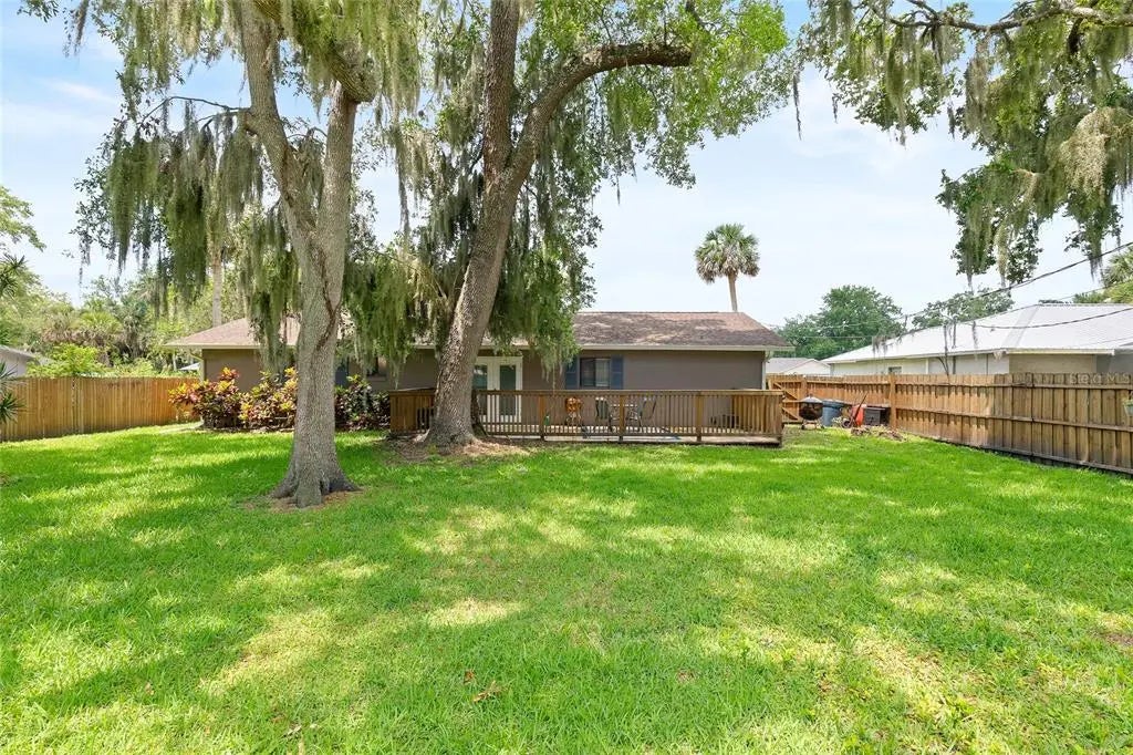 Under contract-accepting backup offers. Welcome to this charming three-bedroom, two-bath residence nestled on a generous 10,000 sq ft lot in the heart of Edgewater, Florida. This open-concept home features spacious living and dining areas with durable laminate wood flooring throughout. The expansive backyard is fully fenced and beautifully framed by mature landscaping, offering a peaceful retreat with a large deck ideal for entertaining. A storage shed adds extra utility, and the one-car garage provides added convenience. Roof was replaced December 2019. Newer appliances including stove, dishwasher, washer and dryer, Water heater 2022. The home has not flooded, per seller, and includes a washer and dryer. Offered fully furnished, it presents a unique turnkey opportunity. (Can also be sold unfurnished) An air conditioning includes UV light for cleaner air flow, check-up was completed in May 2025. Ideally located near shopping and entertainment, this property makes for a perfect starter home or investment. Please note: Automobile, select kitchen utensils and contents of the backyard storage shed will not convey.