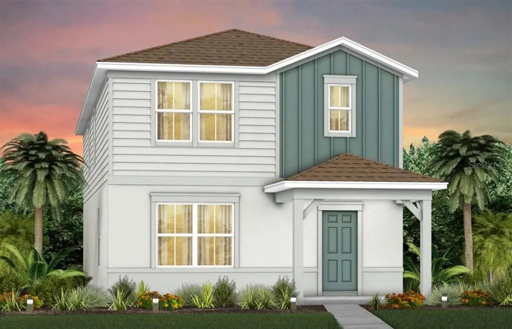 Introducing the Haddock bungalow by Pulte, a brand-new home that combines modern design and ultimate comfort. Featuring our Coastal exterior, this home includes a charming front porch, 4 spacious bedrooms, 2 full bathrooms, a powder room, a covered lanai, and a 2-car rear-load detached garage—set on a homesite overlooking the soccer fields and walking distance to other community amenities. The heart of the home is the open-concept kitchen, café, and gathering room, all bathed in natural light. This inviting space is perfect for both everyday living and entertaining. The kitchen boasts a large center island, a convenient storage pantry, and top-of-the-line Whirlpool stainless steel appliances—including a refrigerator and vented microwave. Elkin white cabinets, a decorative tile backsplash, and Lagoon quartz countertops complete the sophisticated look. Just off the café, step out to the expansive covered lanai, bringing a seamless indoor-outdoor living experience. For added convenience, the first floor includes a powder room and coat closet. Upstairs, you’ll find the private owner’s suite, three additional bedrooms, a second full bathroom, and the laundry room. The owner’s suite is a true retreat, featuring a walk-in closet and a luxurious en suite bathroom with a glass-enclosed shower, quartz-topped dual vanity, private water closet, and linen closet. Throughout the first floor, laundry room and bathrooms, enjoy the beauty of porcelain tile flooring, while plush, stain-resistant Shaw carpet covers the stairs, loft, and bedrooms, adding comfort and style. Smart home features include a smart thermostat, a smart doorbell, and additional LED downlights—ensuring your home is as connected as it is stunning. For added convenience from day one, this home comes complete with 2" faux wood blinds, as well as a washer and dryer! This new construction home perfectly blends luxury, convenience, and modern design, making it the ideal place to live and unwind.
