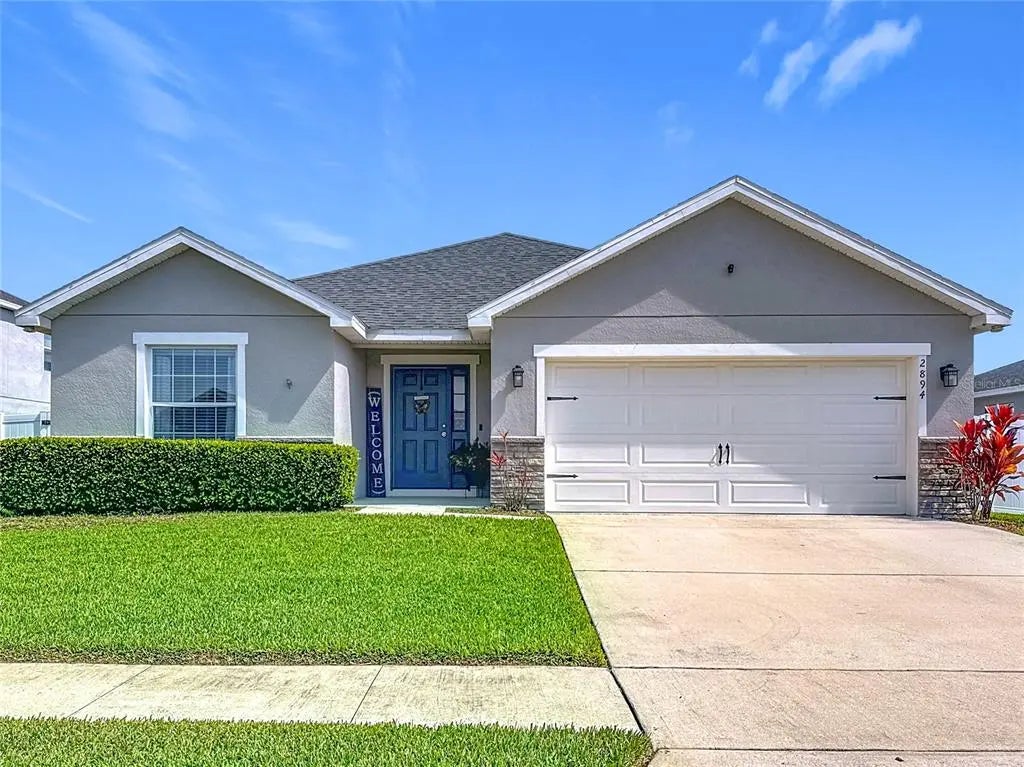 Under contract-accepting backup offers. Welcome to this beautiful 4 Bedroom 2 bath home which has been meticulously maintained in the Gramercy Farms Community. As you arrive, you're welcomed by the professionally maintained green grass and completely fenced yard. You will be impressed with the open floor plan with a spacious gathering room, dining area, and an open kitchen with counter-height Island and an oversized walk-in pantry. The kitchen comes with large cabinets with crown molding and fully equipped with stainless steel appliances! Volume ceilings throughout the living area, dedicated laundry room. The owner's suite features an elegant tray ceiling, and an upgraded en-suite bathroom with garden tub, dual sinks, and a walk-in closet. The screened in rear patio is great to unwind and enjoy the Florida weather or watch your favorite sport which includes TV hookup and fan already installed for your convenience. This home also features a built-in pest control system. The spacious two car garage has a side door making it convenient to access the exterior of the home. It does not end there; the laundry room comes equipped with front load washer and dryer! Within a short walk this beautiful, landscaped community offers a playground, dog park, and a basketball court, for entertainment. Easy access to the FL Turnpike which provides a convenient way to visit the Central Florida attractions including Disney World, Universal Orlando, and many more! Located nearby premier shopping, grocery stores, and many restaurants. Also, top rated schools. Come see it today!