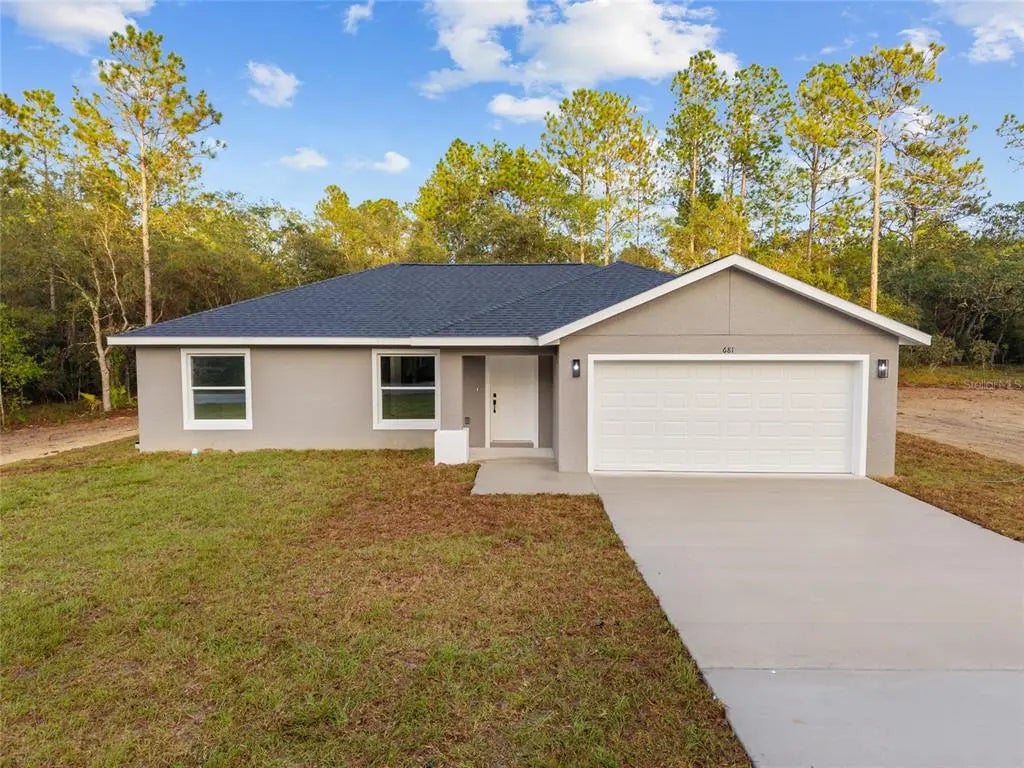 One or more photo(s) has been virtually staged. Brand new MOVE IN READY concrete block home! Not all new construction is created equal—this one is packed with premium upgrades and standout style. See the difference for yourself as you step into this PREMIUM UPGRADED MODEL, beautifully set on a .99 acre lot. Built with CONCRETE BLOCK construction and featuring vaulted ceilings, this home offers both long-lasting durability and elevated style. The open, split floor plan flows effortlessly with LVP flooring throughout (no carpet here), giving the home a clean, modern finish. The kitchen and bathrooms are equipped with granite countertops, white shaker-style soft-close cabinets, and STAINLESS-STEEL appliances. The primary suite includes a large walk-in closet and a beautifully tiled shower with a GLASS enclosure—no fiberglass or acrylic inserts here. The second bathroom offers a PORCELAIN TUB surrounded by DESIGNER TILE, creating a polished, upscale feel in every detail. With NO HOA and no deed restrictions, you’ll enjoy the freedom to truly make this property your own. Located just 15 minutes from downtown Dunnellon and 10 minutes from Rainbow Springs State Park, you’re close to kayaking, swimming, diving, and fishing. The nearby Rainbow Lakes Community Center features tennis courts, racquetball, basketball, a baseball field, and a playground. Tiger Lake with a public boat ramp is also just minutes away. This home blends premium upgrades, spacious land, and a prime location—making it a rare and exciting opportunity. Call today for more information and take the first step towards making this house your home!