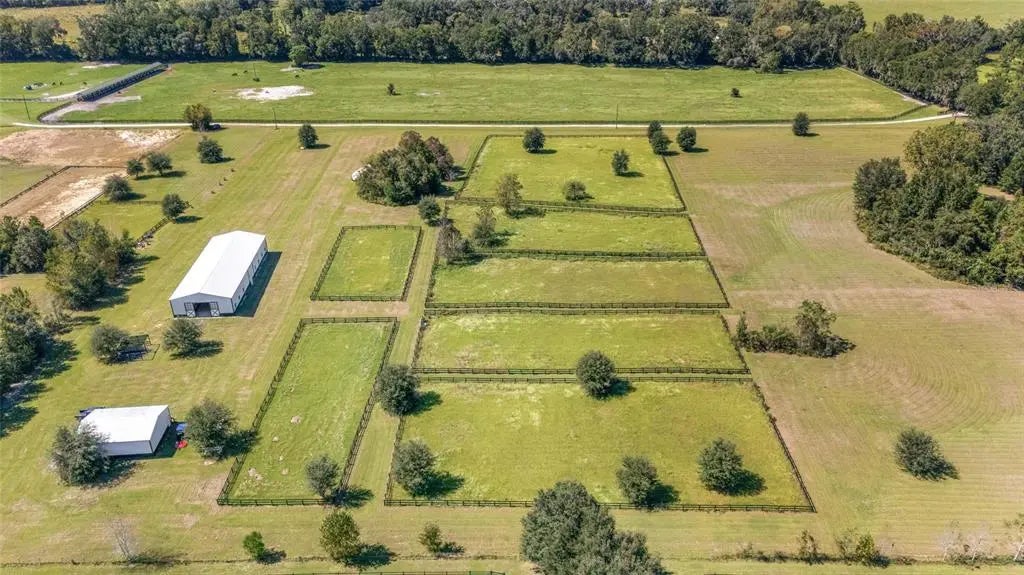 Turnkey 20-Acre Horse Farm in Prime NW Ocala Location. Situated on a quiet, picturesque road surrounded by premier horse farms, this exceptional 20-acre equestrian property is a rare find in Ocala’s highly sought-after northwest corridor. Just 2 minutes from HITS and only 10 minutes to WEC, this turnkey farm is perfectly located for the serious equestrian. The newly constructed center-aisle barn is thoughtfully designed and impeccably outfitted with 12 oversized stalls featuring European fronts, automatic waterers, and comfort stall mat system for ultimate equine comfort. The barn also includes two large grooming stalls, a climate-controlled tack room with custom cabinetry, and a spacious feed room complete with built in storage. A 1/2 bath with laundry adds convenience, while two outdoor wash racks, a water filtration system, and an large three-bay equipment garage/workshop/storage round out the amenities. Additional equine facilities include eight fenced paddocks, each with water and separated by safe grass 'hacking' lanes. Enjoy an irrigated dressage arena, a large grass jump field, and plenty of room to school on the property. There’s even an RV hookup with septic for added flexibility. A truly move-in-ready facility that blends high functionality with thoughtful design—don’t miss this rare opportunity in one of Ocala’s premier equestrian areas. The property is being sold with tractor, zero-turn mowever, Jumps, etc..... Property is ready for it's new owners for the 2025/2026 Horse Show Season.