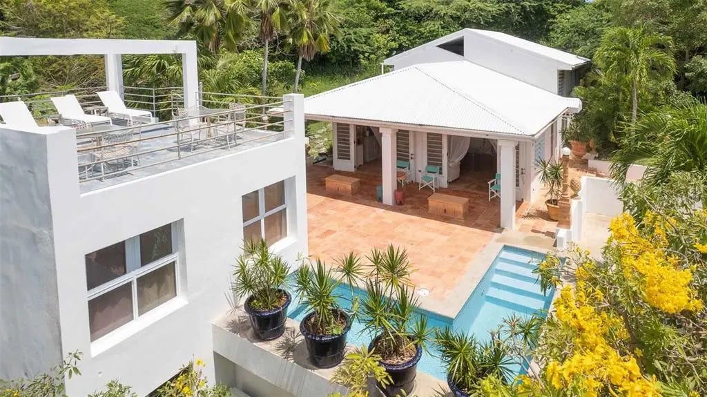 The pool area, surrounded by natural landscaping, is designed for relaxing or entertaining. At 4 feet deep and 5 feet wide with built-in steps, it offers a refreshing spot to cool off under the Caribbean sun.