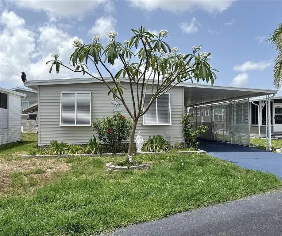 This totally updated home with more than 1,100 sq. ft of living space includes a beautifully finished 200 sq ft Florida room with laminate flooring, drop ceiling and Bahama shutters that can be used as an office/hobby or additional living space. This appealing home is located within a short walk to the community's waterfront park with fishing dock on a saltwater canal--relax and watch the dolphins and manatee play or go fishing! The home was updated in 2022 and features a remodeled kitchen with new soft close Shaker cabinets and drawers, sparkling quartz countertops and ceramic tile backsplash; 2022 Whirlpool refrigerator and GE stove, stainless steel farmhouse sink and gooseneck spout; 2022 HVAC is high-end American Standard 2.5 ton package unit with heat and air; 2022 tilt-in double paned windows throughout for easy cleaning; updated baths in 2023 includes new cabinet and sink with quartz counter top and tub/shower combo in guest bath and new cabinets and sink with walk-in shower in master bath and tile floors in both baths. 2016 roof over has 20-year transferrable warranty. Newer water heater--about 4 years old. New plywood subfloors and waterproof wide plank laminate flooring installed in all rooms (except Florida room which has cement subfloor) in mid April 2025. New laminate flooring has Lifetime Warranty. Dining and living room area have crown molding and baseboards. Interior paint in pastel colors completed in 2023-2024. Backyard paver patio for barbecuing and relaxing. Ring door bell included. Long carport handles two cars easily and driveway has been resurfaced. Utility shed has 2025 washer and dryer with overhead fluorescent light. Clamshell awnings and Bahama shutters on windows for wind protection. Mature landscaping give finishing touches to the property, and there is a sprinkler system in place with water supplied by the Co-op. Termite treatment in 2024 with transferable warranty. Price includes share for the lot and ownership in the Co-op. Low monthly maintenance fee of $380 includes water/sewer/trash pick up/ 24 hr manned gate/lawn mowing/private streets/heated pool/fitness/billiards/clubhouse and so much more. Two dogs or cats up to 35 pounds are welcomed; two pets total each household. Americana Cove is conveniently located to downtown St. Petersburg (10 mins away), two airports (15 mins away) and beaches (25 mins away). Don't miss this move-in ready home!
