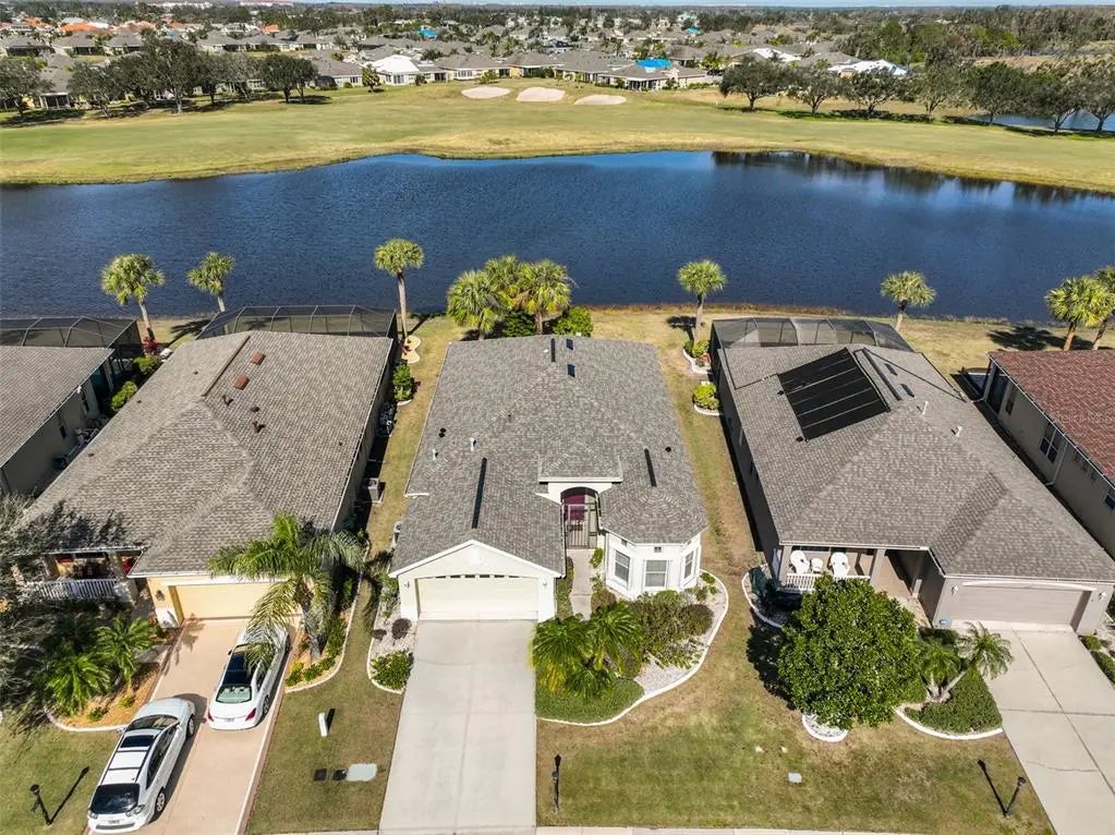 Click on 3D tour ------- MOTIVATED SELLERS! TERRIFIC WATER & GOLF COURSE VIEWS! Welcome to active & fun retirement living in the 55+ resort-style community of Renaissance, where you'll feel like you're on vacation every day. This lovely, PARTIALLY FURNISHED, 2 bed/2 bath & den home boasts almost 2000 square feet of living space and is nestled on a premium lot. You'll be impressed with the neutral decor, high ceilings, lots of ceramic tile flooring and stunning WATER & GOLF COURSE VIEWS ALL ACROSS THE REAR OF THE HOME. The eat-in kitchen has a solar tube for extra lighting, has plenty of cabinetry & counter space and opens up to the comfortable living/dining room area for easy living. The large private owner's suite has an extra sitting area w/slider to the lanai, has a nice ensuite bathroom w/walk-in shower and plenty of closet space. The guest bedroom & bathroom are at the opposite end of the home for added privacy. The den/office can easily be used for a 3rd bedroom if needed. The lanai is the perfect space to relax & enjoy the various birds & wildlife. As an added bonus, there is an awesome grill w/hood for the BBQ lovers. This home has several updates, ROOF 2022, FURNACE 2019 W/UV LIGHT, DISPOSAL 2019, HURRICANE SHUTTERS ALL AROUND 2018, EXTERIOR PAINT 2018, WATER HEATER 2017 AND NATURAL GAS. THIS HOME ALSO COMES WITH A 1 YEAR HOME WARRANTY FOR WORRY-FREE LIVING. The neighborhood Club Renaissance is just a short golf cart ride up the street, where you can enjoy dining, drinks, resort-style pool, fitness classes, spa, social activities, and so much more. You'll also have access to all Sun City Center amenities, such as shopping, restaurants, banking, doctors, numerous social clubs, pickleball, and tons more, all accessible by golf cart. So come and visit this wonderful home today and see why you'll want to call it yours!