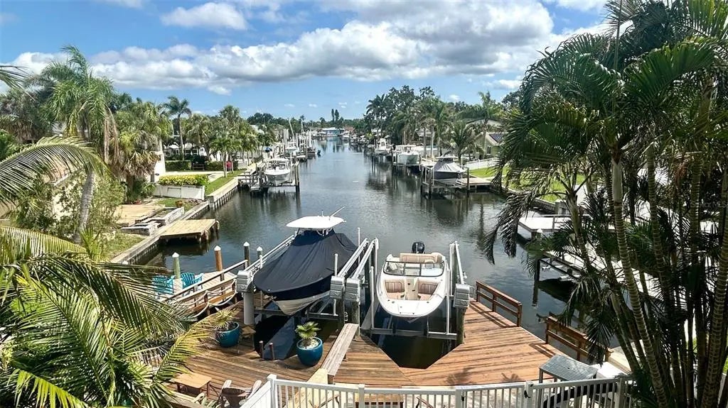 Welcome to your dream waterfront retreat, located in one of the most desirable neighborhoods just minutes from downtown St. Petersburg. This beautifully updated home offers upgrades throughout. Let's start with the resort-style pool area. Upgraded in 2020, this area is at the side of the house meaning it offers complete privacy. Step inside to an open concept living space with vaulted ceilings and a chef's kitchen featuring a light, airy design with upgraded appliances, including a Thermador range and a Subzero refrigerator. The kitchen also includes quartz countertops, soft-close drawers, pull-out drawers, a walk-in pantry and pop-up outlets. The large island includes bar seating for five and overlooks a spacious living room centered around a gas fireplace. A separate dining area completes the main living space, making it ideal for gatherings and everyday living. Downstairs, you'll find three generously sized bedrooms. One includes its own en suite bathroom for added privacy, while two of the bedrooms offer waterfront views. Upstairs is dedicated entirely to the expansive primary suite, complete with a large bedroom, a walk-in closet to die for with its own island and a conveniently located laundry room. There's even space to add a wet bar! The primary bath is large and luxurious. It includes quartz countertops and marble floors, a $10k heated whirlpool tub, and a Regina Andrews chandelier. The highlight of the second floor is a wide paver balcony that provides a beautiful water view looking straight down the canal—not in your neighbor's home. The pool has an attached spa, surrounded by upgraded Travertine pavers and mature landscaping that provides both beauty and shade. A covered porch offers a peaceful place to relax and enjoy the pool view. The entire backyard is fully fenced for privacy and security. Two outdoor seating spaces offer views down the canal - not into your neighbor's backyard. The garage has a 220-volt EV charging station, the home has a whole house water filtration system and a whole house alarm system. Waterfront features include a spacious dock with a 7,000lb boat lift and outdoor dock seating. Hurricane-impact windows are installed throughout the home, offering peace of mind and energy efficiency. Kayak and stand-up paddle board storage is on the side yard. New garage door 2024, and upgraded electrical panel 2023. Every luxurious touch that could be added to this home was. Please open the Luxury Upgrades attachment to this listing to see ALL the upgrades. Whether you're commuting or cruising, the location is unbeatable—just 15 minutes to downtown St. Pete by boat or car, and only 25 minutes to Tampa International Airport. This is more than a home—it’s a lifestyle.