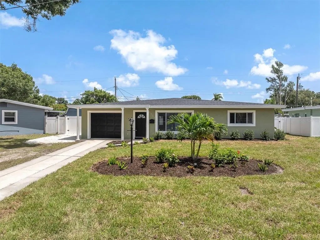 Under contract-accepting backup offers. Welcome home to this modern, single family solid block home (3bd/2ba w/garage, 1677 sq ft) perfectly situated in a quiet and friendly neighborhood that is centrally located between downtown St. Pete and the beaches. Rare opportunity: Assumable loan at 2.75 % for lower monthly payments available to qualified buyers! Walk into this beautifully updated and well-maintained home with lots of natural light and thoughtful upgrades, including a whole-house water softener and filter. The home boasts a large dining area and welcoming kitchen with updated features, including solid wood cabinets, granite countertops, stainless steel appliances, large island with dining overhang, pantry and canned lighting. The split floor plan includes two secondary bedrooms with larger sliding door closets and a shared shower/tub bathroom with extra cabinet storage and a linen closet at the south side of the home. The extra-large private master suite with dual shower heads and walk-in closet sits at the north side of the home. Dual A/C units allow for separate temperature control of the north and south sides of the home. The spacious living room provides access to the private, expansive backyard and shaded paver patio through sliding glass doors with inset blinds. The freshly landscaped front and back yards feature a sprinkler system and beautiful foliage. Behind the double-gated white vinyl fence, there is space for your boat or toys on a shell pad on the west side of the home. Home is located off the main roads of the neighborhood and is a short 5-minute walk to highly rated Westgate Elementary, only 0.7 miles via car or sidewalks to Northwest Park, 0.9 miles to Publix, 12 minutes to downtown St. Pete, and 15 minutes to the beaches. No hurricane damage, not in a high-risk flood zone, flood insurance is not mandated! Schedule your showing before this gem is gone!
