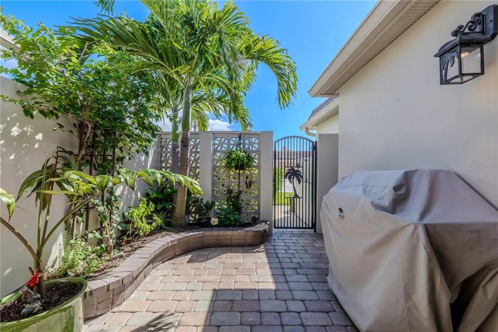 Welcome to this beautifully upgraded waterfront villa that embodies the ease and charm of coastal Florida living. Designed with care and attention to detail, it provides a perfect balance of comfort, elegance, and function. A private brick-paver courtyard surrounded by tropical landscaping welcomes you home. The space feels peaceful and inviting, with room for a grill or café table and a wall-mounted fan to keep the air cool while you relax outdoors. The decorative glass front door opens to a bright, open-concept interior filled with natural light and a warm coastal feel. Ceramic tile floors flow throughout, creating a polished and cohesive look. Crown molding adds subtle character, and recessed lighting gives each room a soft, even glow. A kitchen window overlooks the courtyard, connecting the indoor and outdoor spaces beautifully. The kitchen blends timeless design with modern convenience. A large granite island provides seating, storage, apron sink with garbage disposal (2020), touch faucet (2025) and built-in outlets. Custom cabinetry and under-cabinet lighting highlight the craftsmanship. The Dacor refrigerator (2020), Sharp under-counter microwave (2025), double built-in oven (2025), dishwasher (2025), and induction range (2021) create a kitchen ready for both everyday living and entertaining. The sleek range hood, pot filler, and dual-zone wine and beverage refrigerator add thoughtful touches, while the built-in TV nook keeps the space relaxed and functional. The dining area flows naturally into the living room, where wide sliding glass doors open to the canal and fill the space with light. The open layout feels spacious yet cozy, ideal for gatherings or quiet evenings at home. The primary suite is a calm retreat with two closets, including one with custom built-ins. The ensuite bathroom feels like a spa with split vanities, stone counters, lighted mirrors, and custom water faucets that complete the designer look. The rainfall shower and jetted soaking tub create the perfect place to unwind, while the built-in linen storage and private water closet add convenience. The second bedroom is versatile, featuring both a walk-in and standard closet. Sliding glass doors installed in 2020 open to the front courtyard, and the retractable screen allows fresh air in during cooler months. The nearby bathroom continues the home’s cohesive style with a frameless shower, stone vanity with copper sink, and built-in storage. At the back of the home, the bonus room overlooks the canal and provides a comfortable space to read, relax, or entertain. Built-in shelving, a fireplace, a TV area, and a storage closet add flexibility. Through the glass doors, the composite deck completed in 2022 extends the living area outdoors, creating a peaceful place to enjoy canal views and breezes from sunrise to sunset. The private dock includes a 16,000-pound oversized boat lift for up to a 36-foot vessel, 50-amp shore power, remote color-changing railing lights, and a lighted pedestal that casts a soft glow across the water at night. Additional updates include a new roof (2025), leased water softener (2020), and water heater (2020). Located in the gated 55+ community of Boca Ciega Point, residents enjoy a friendly, active lifestyle with access to a clubhouse, shuffleboard, pool, tennis courts, and 24-hour security. Just minutes from Madeira Beach and waterfront dining, this home reflects the comfort, quality, and serenity that define the best of Florida living.