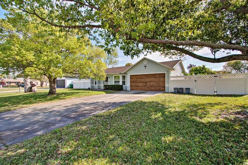 Immaculate Move-In Ready 3-Bedroom Home with Custom Upgrades! Discover this meticulously maintained 3-bedroom, 2-bathroom home featuring a spacious 12’ x 20’ double-pane glass-enclosed Florida Room—perfect for relaxing year-round! The upgraded kitchen boasts custom solid maple cabinets with inlay, granite countertops, and a large 6’ custom-built butcher-block island, complemented by stainless steel appliances and built-in custom wood storage cabinets. Throughout the home, enjoy luxury vinyl flooring, upgraded bathrooms, custom window coverings, and Hunter ceiling fans for added comfort. Additional features include: Bay windows in front; Extra insulation for low electricity bill, built-in storage in the rear window seat, Newer regularly serviced A/C, Energy-efficient double-pane, low-e hurricane windows sliding glass doors, New door handles and hardware, New water heater, new garage door opener, garage springs replaced. Outside, the two- car garage is complemented by two versatile sheds—one set up as a music; art studio (insulated with finished interior under A/C), and another for storage & yard equipment. The vinyl-fenced front yard features a water-saving irrigation system and fruit trees, including tangerine, navel orange, and banana trees! Eligible for homestead tax benefits! Don’t miss out on this stunning home—schedule your private showing today!
